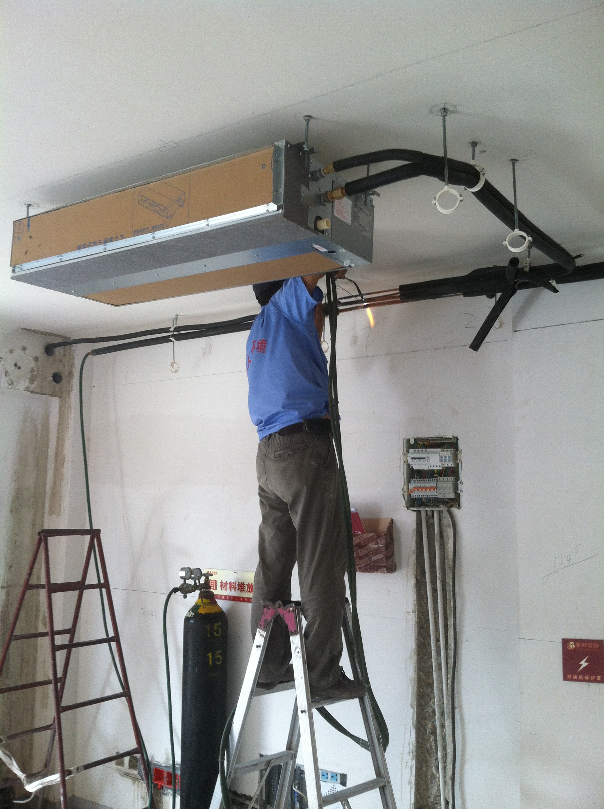 吊裝中央空調室內機,并對內機進行包裹,避免有灰塵雜質進入;