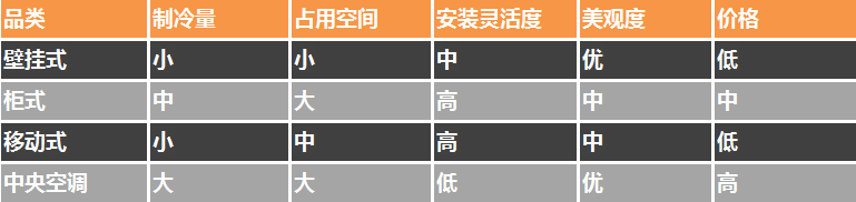 空調(diào)的安裝方式主要有壁掛式、柜式、移動(dòng)式和中央空調(diào)四種,四者的對(duì)比如下所示。