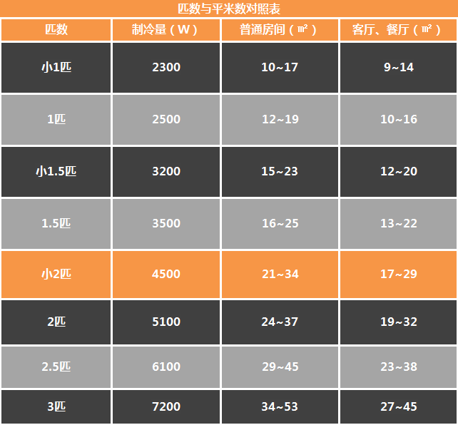 好吧,說人話,就是匹越大制冷能力越強(qiáng)。具體換算成使用面積請(qǐng)看下表。